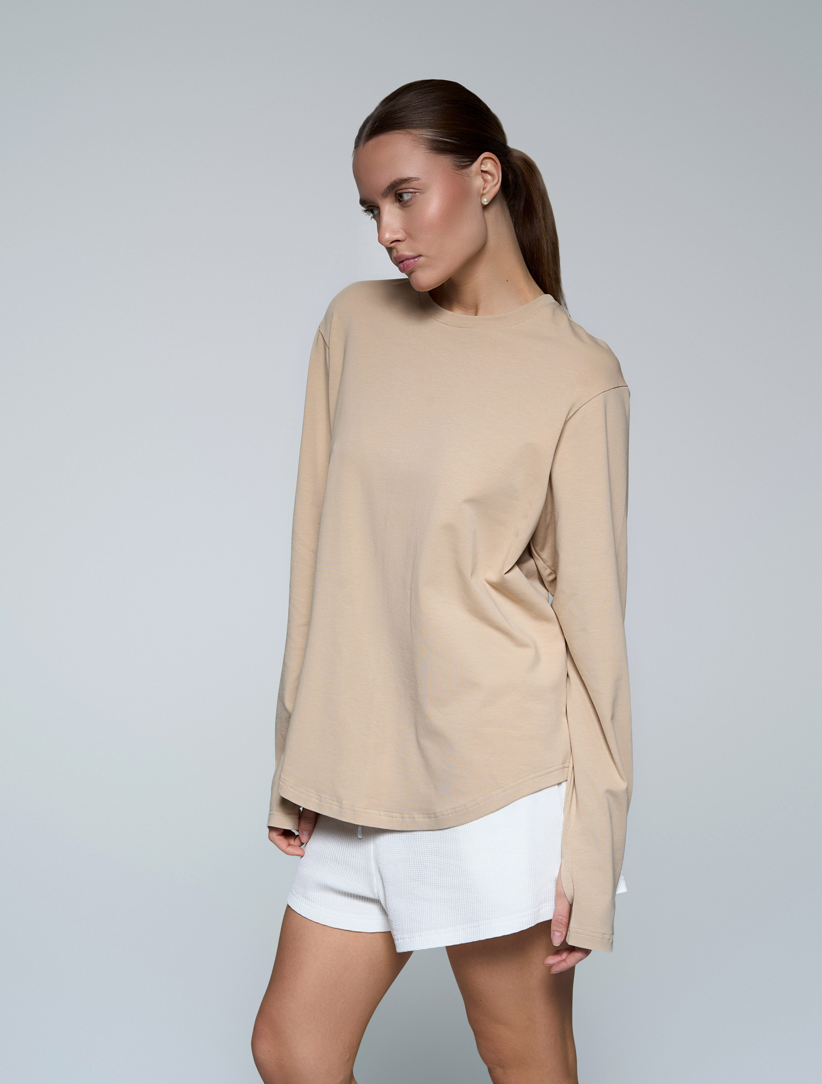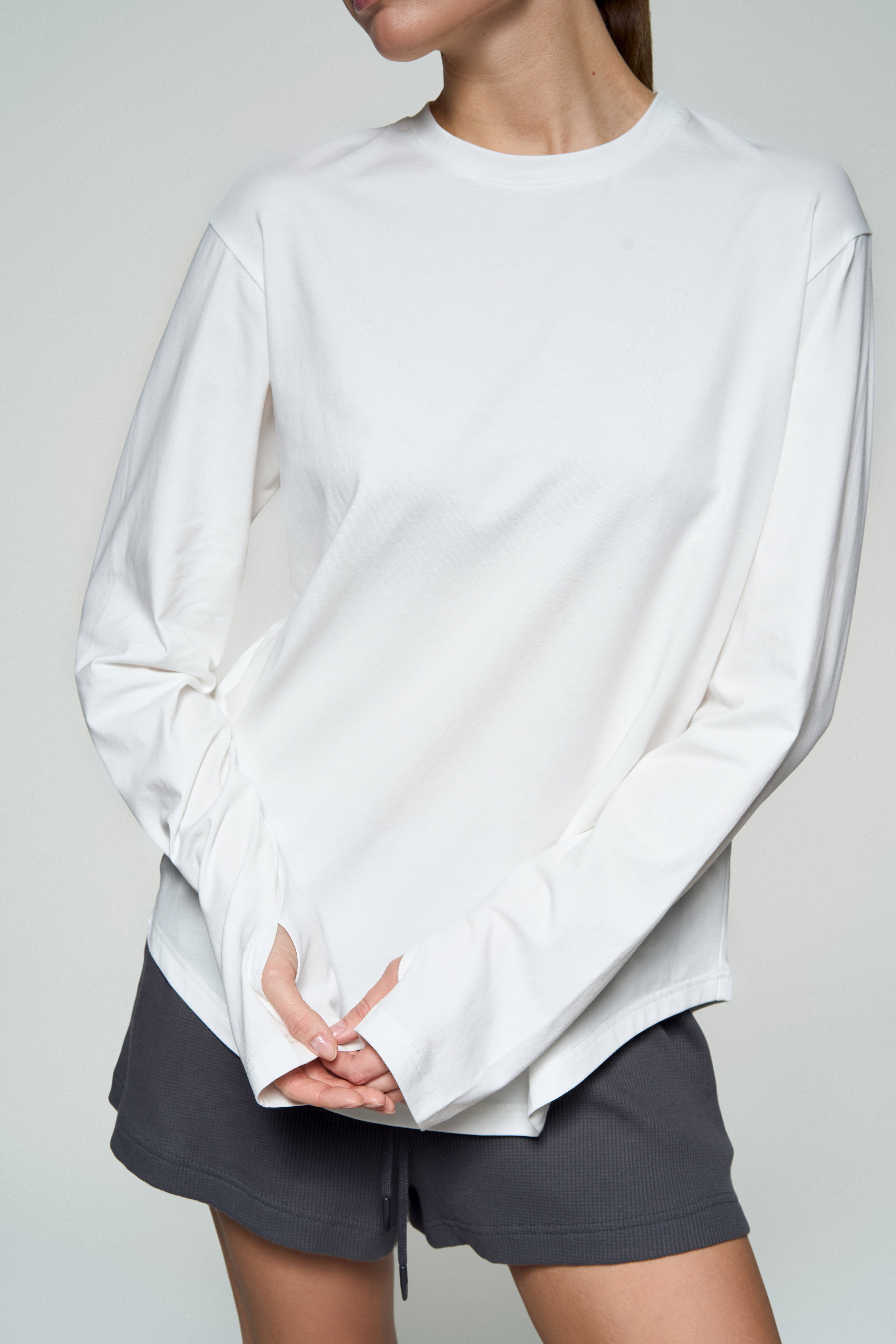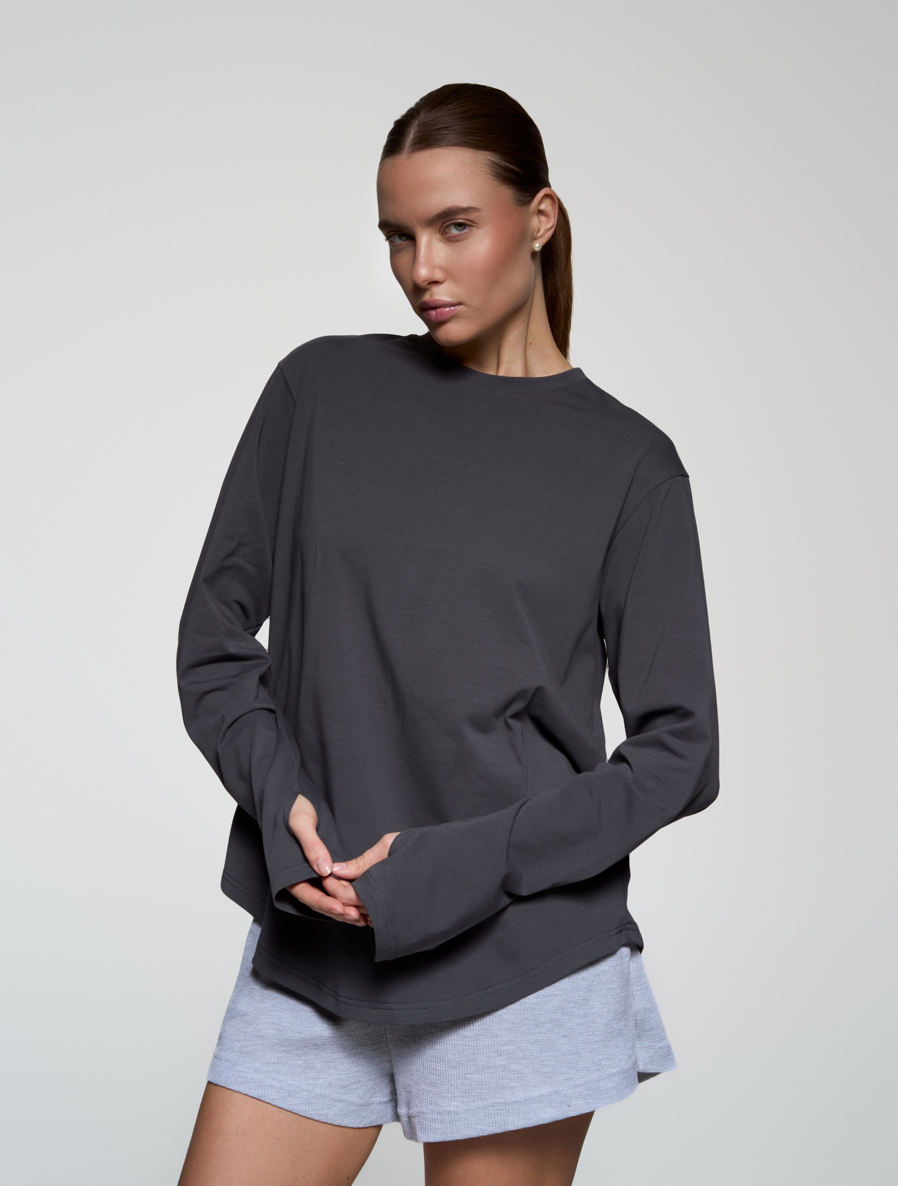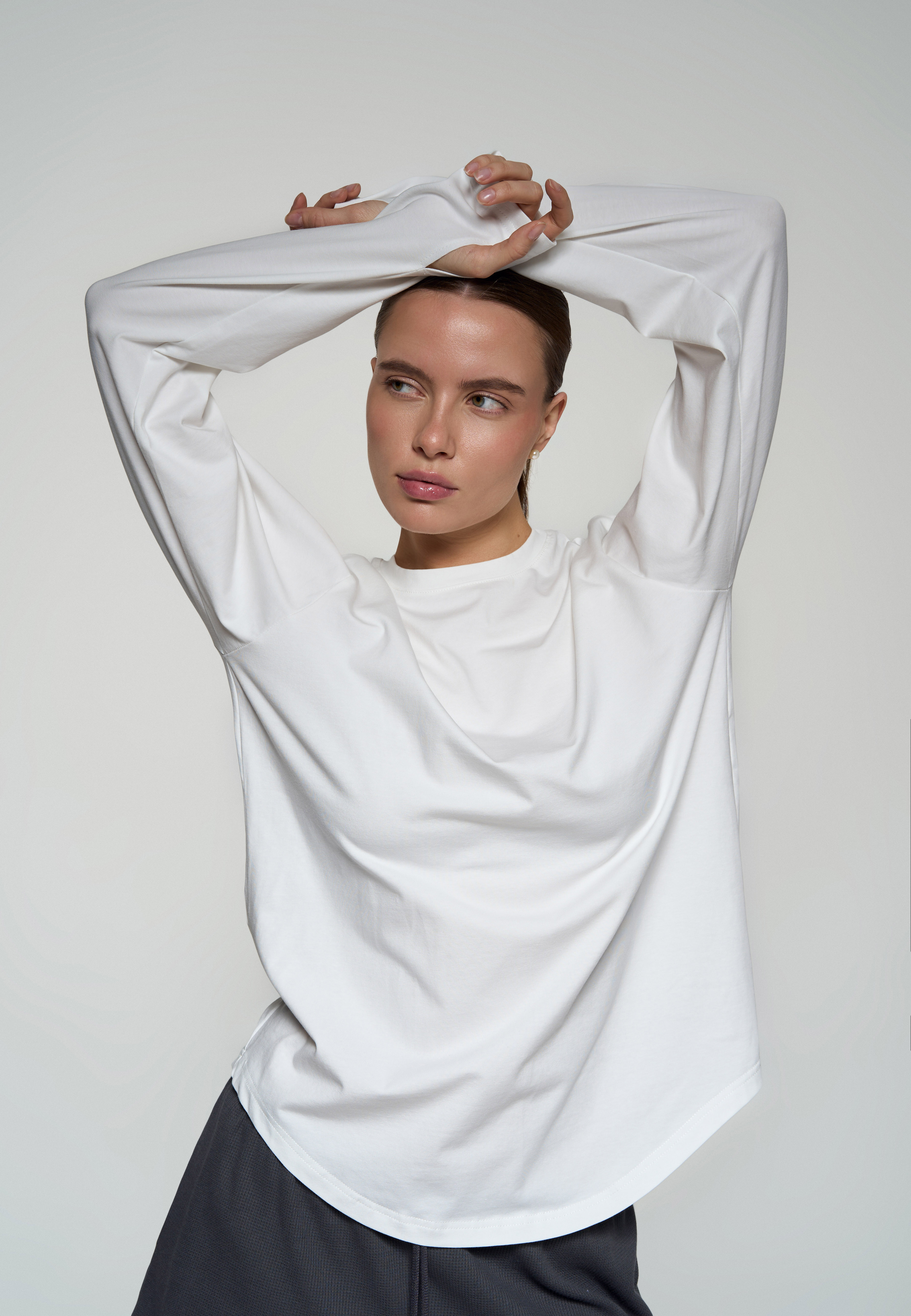 Базовый лонгслив - Прямой крой с плавным низом - Удлиненный рукав с прорезью под палец.