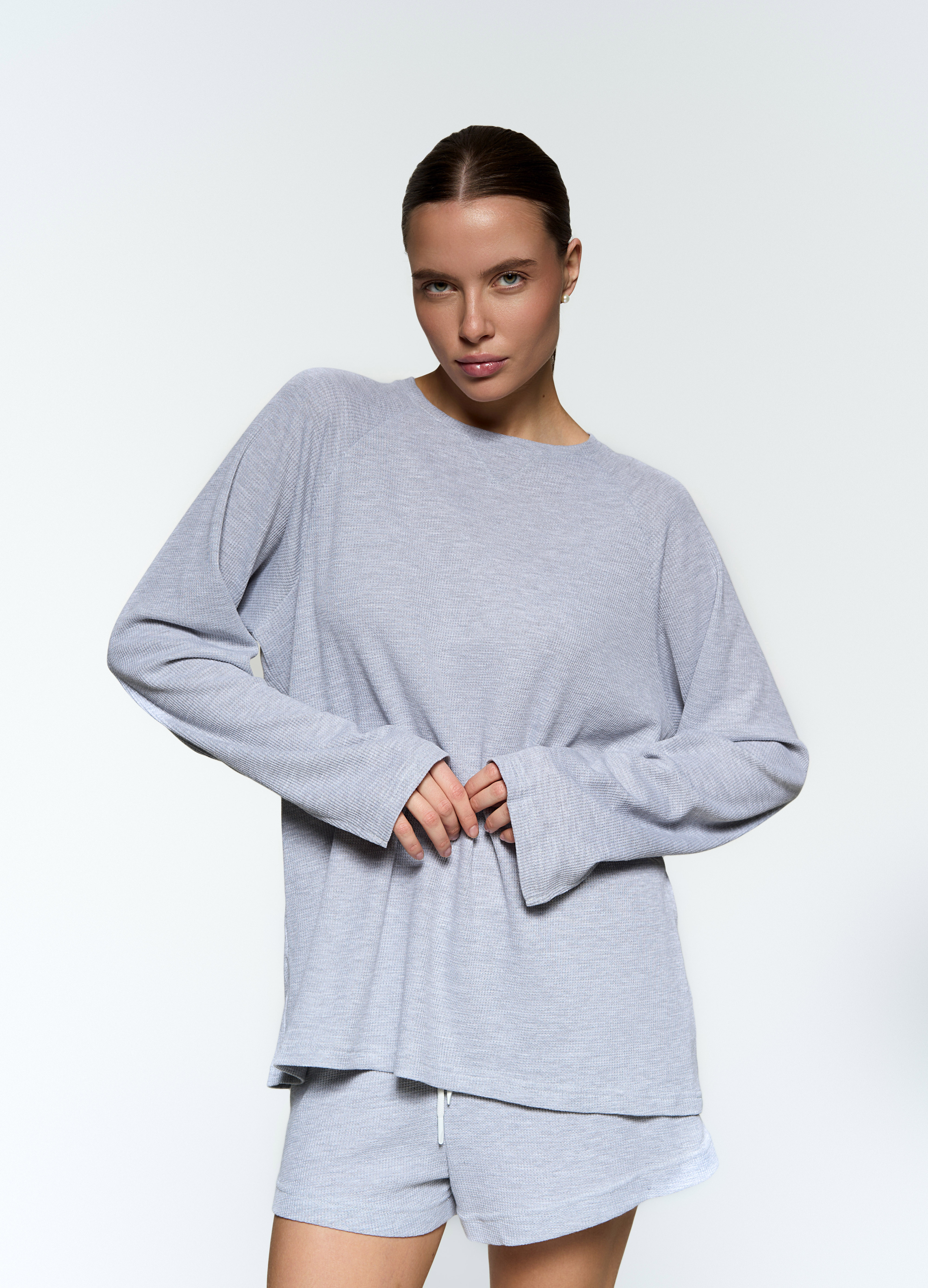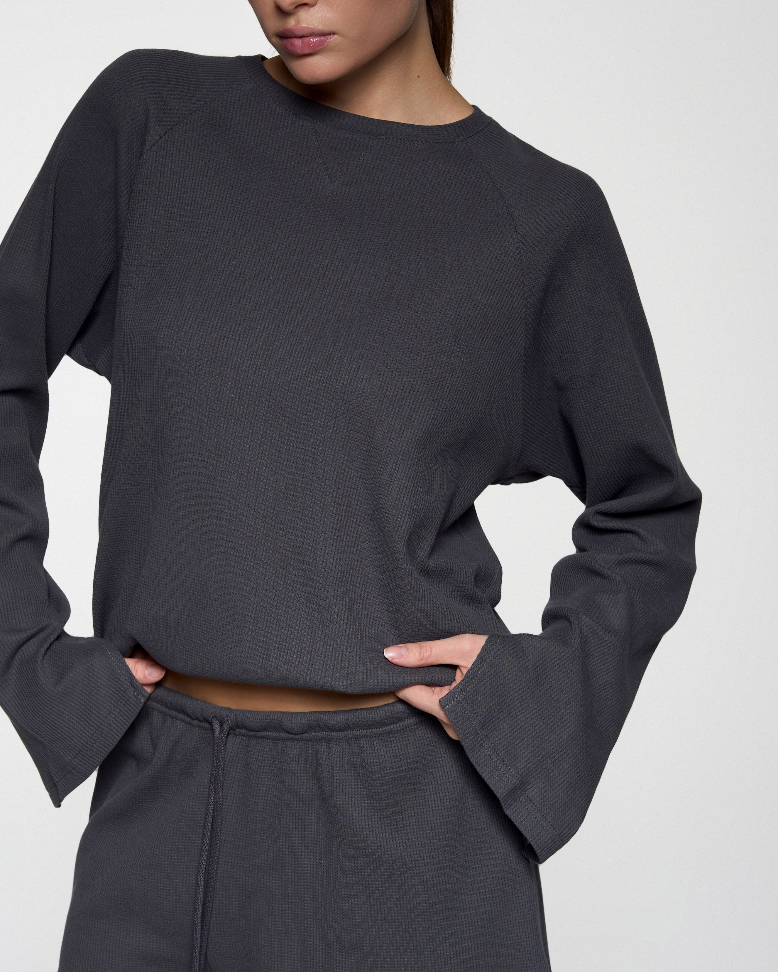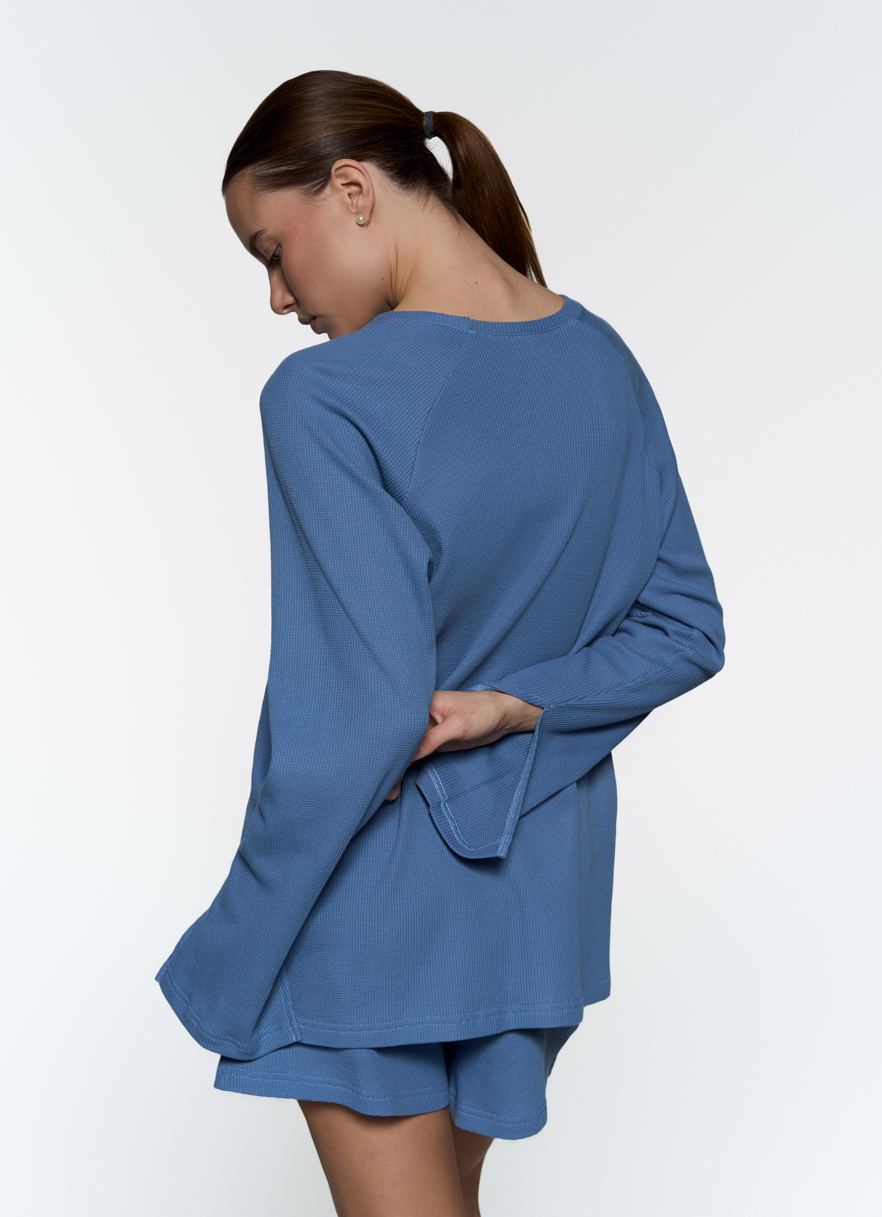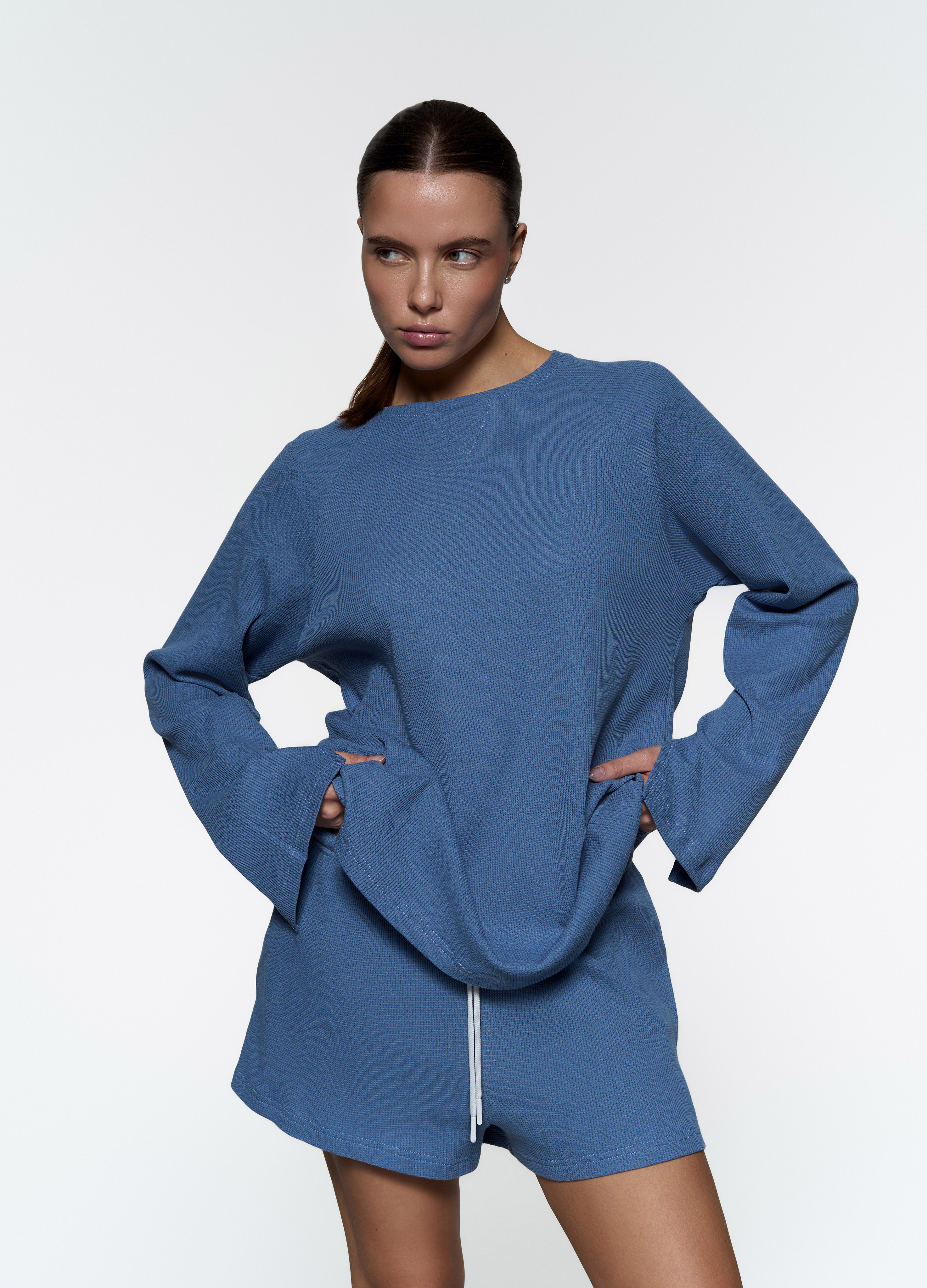 Базовый прямой лонгслив - Свободный крой - Треугольный разрез на рукавах - Мягкая вафельная ткань средней плотности.