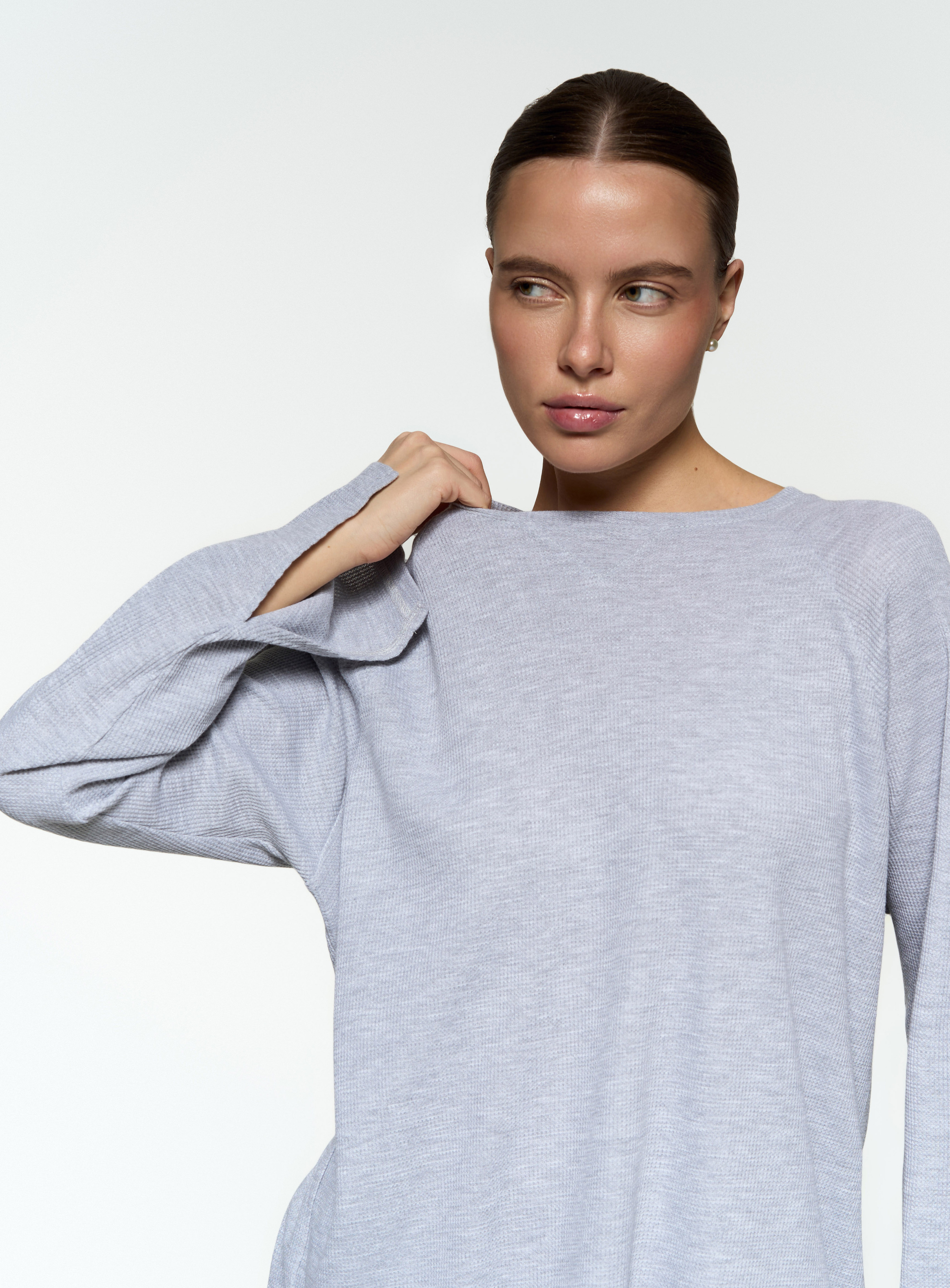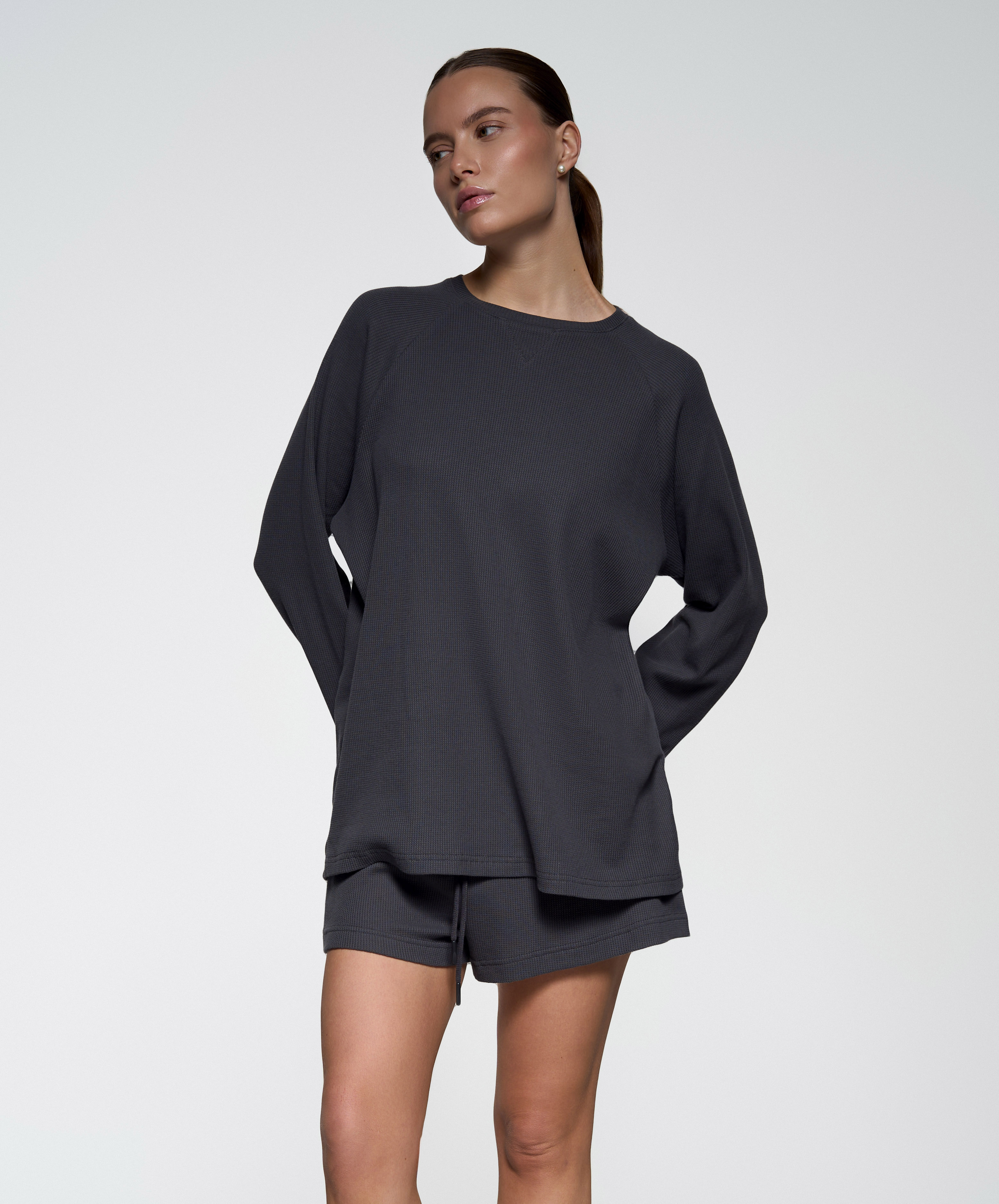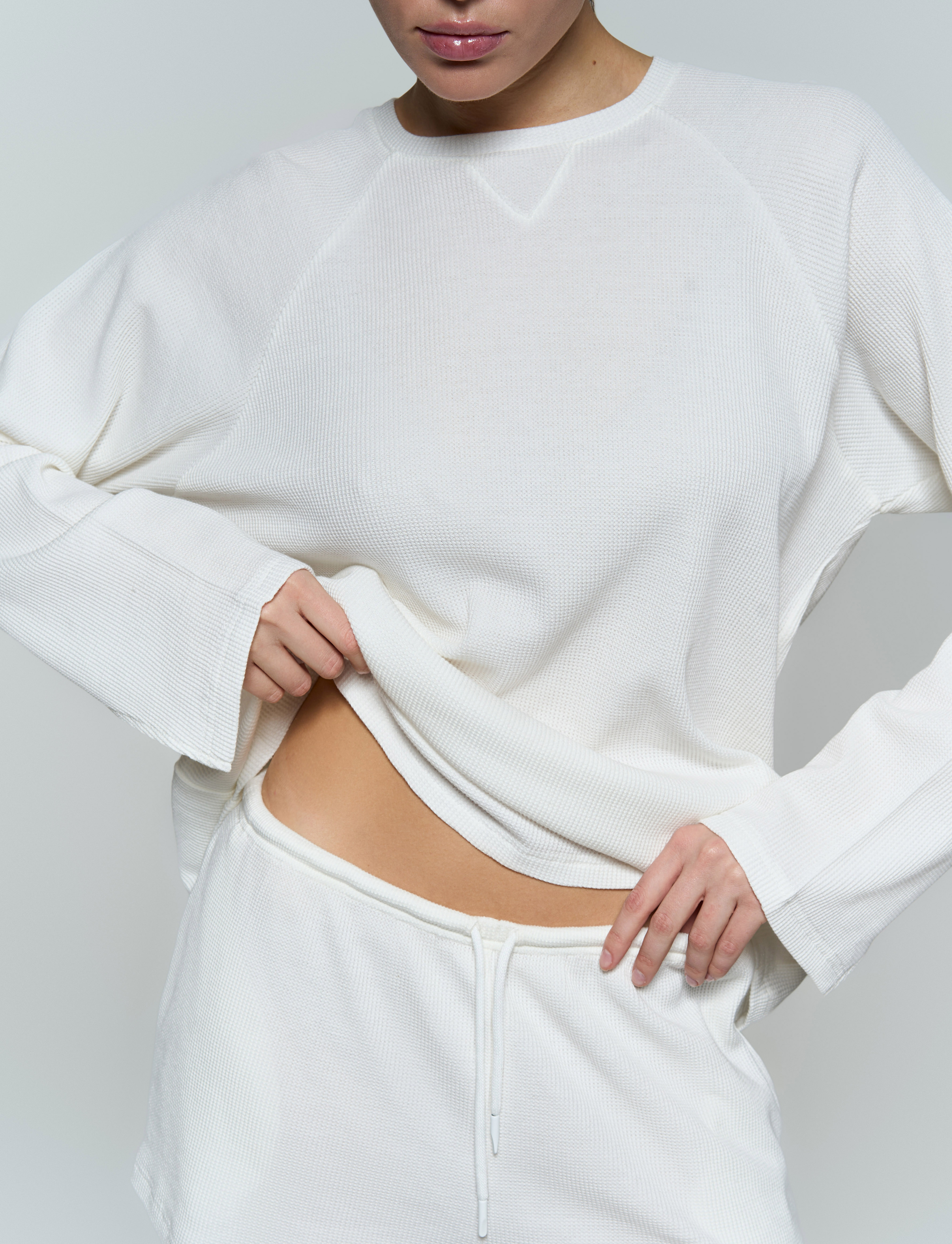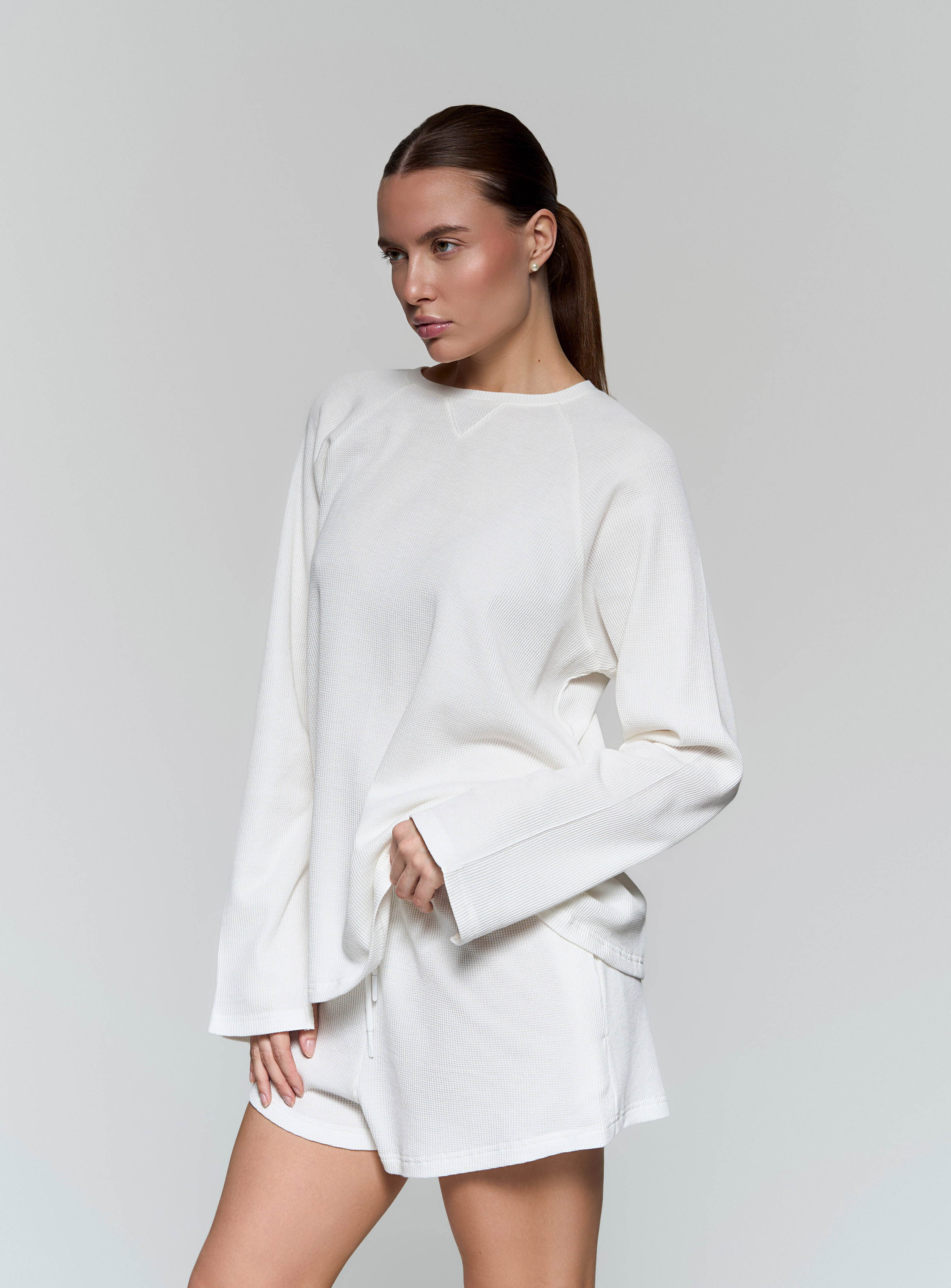 Базовый прямой лонгслив - Свободный крой - Треугольный разрез на рукавах - Мягкая вафельная ткань средней плотности.