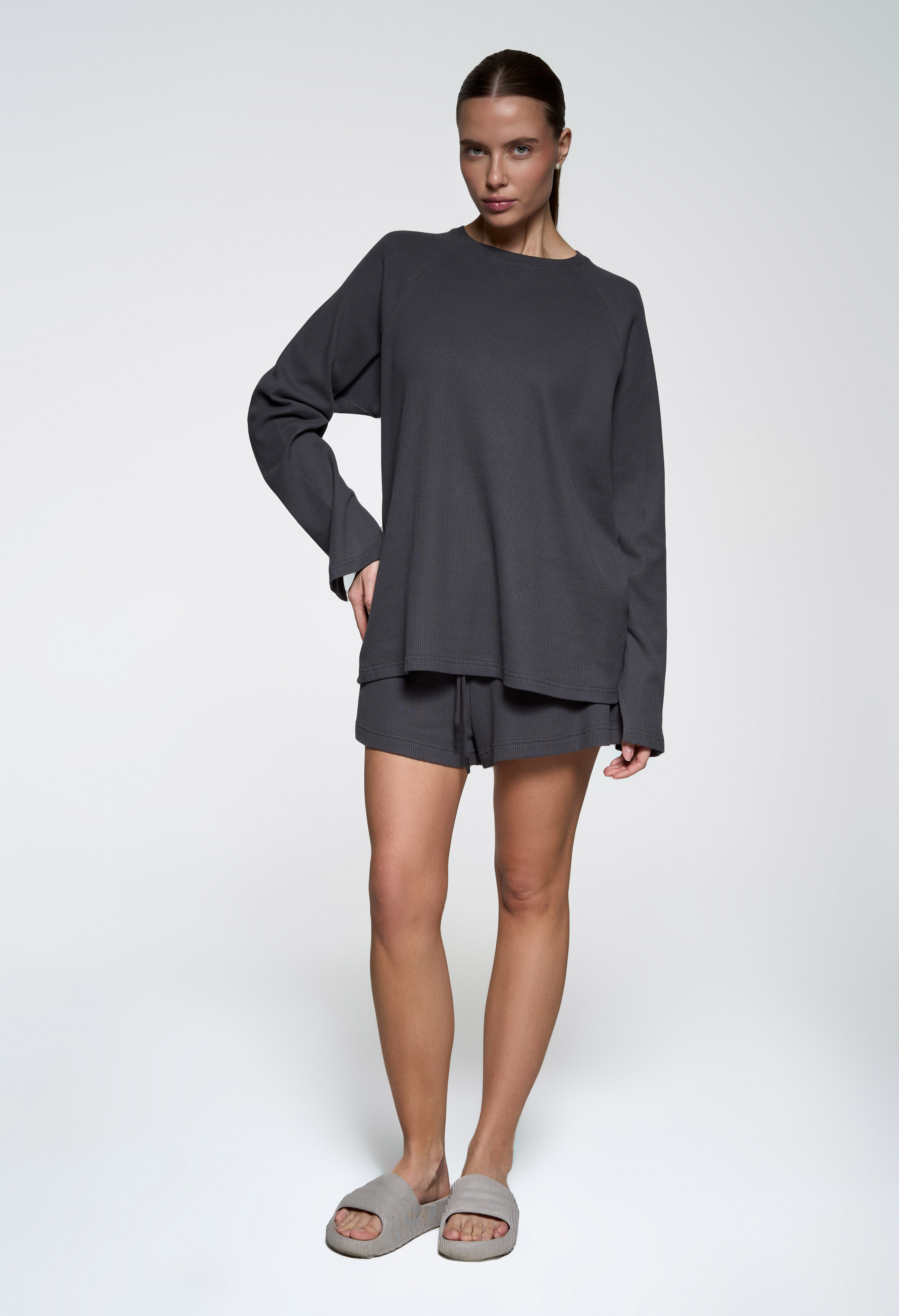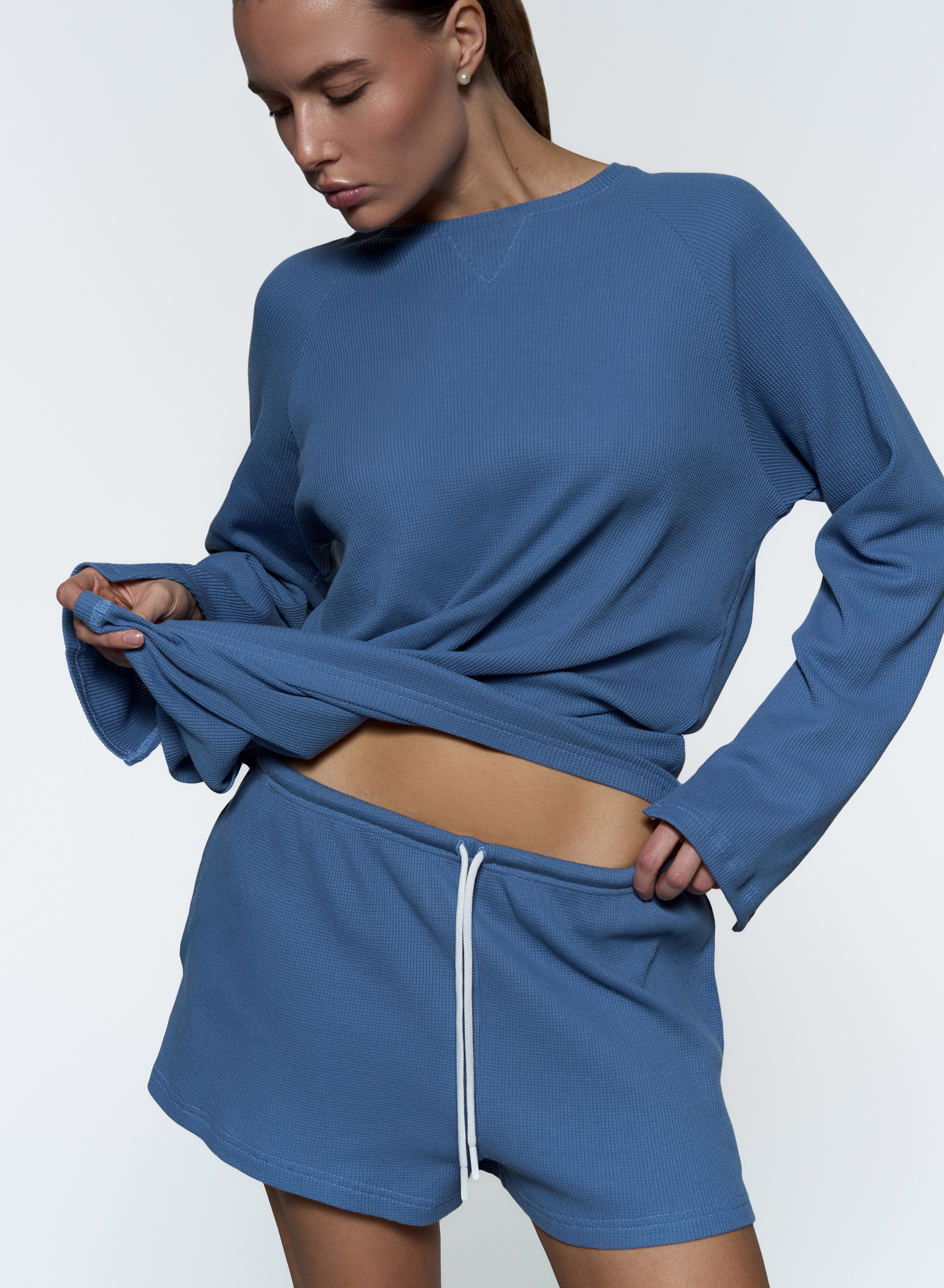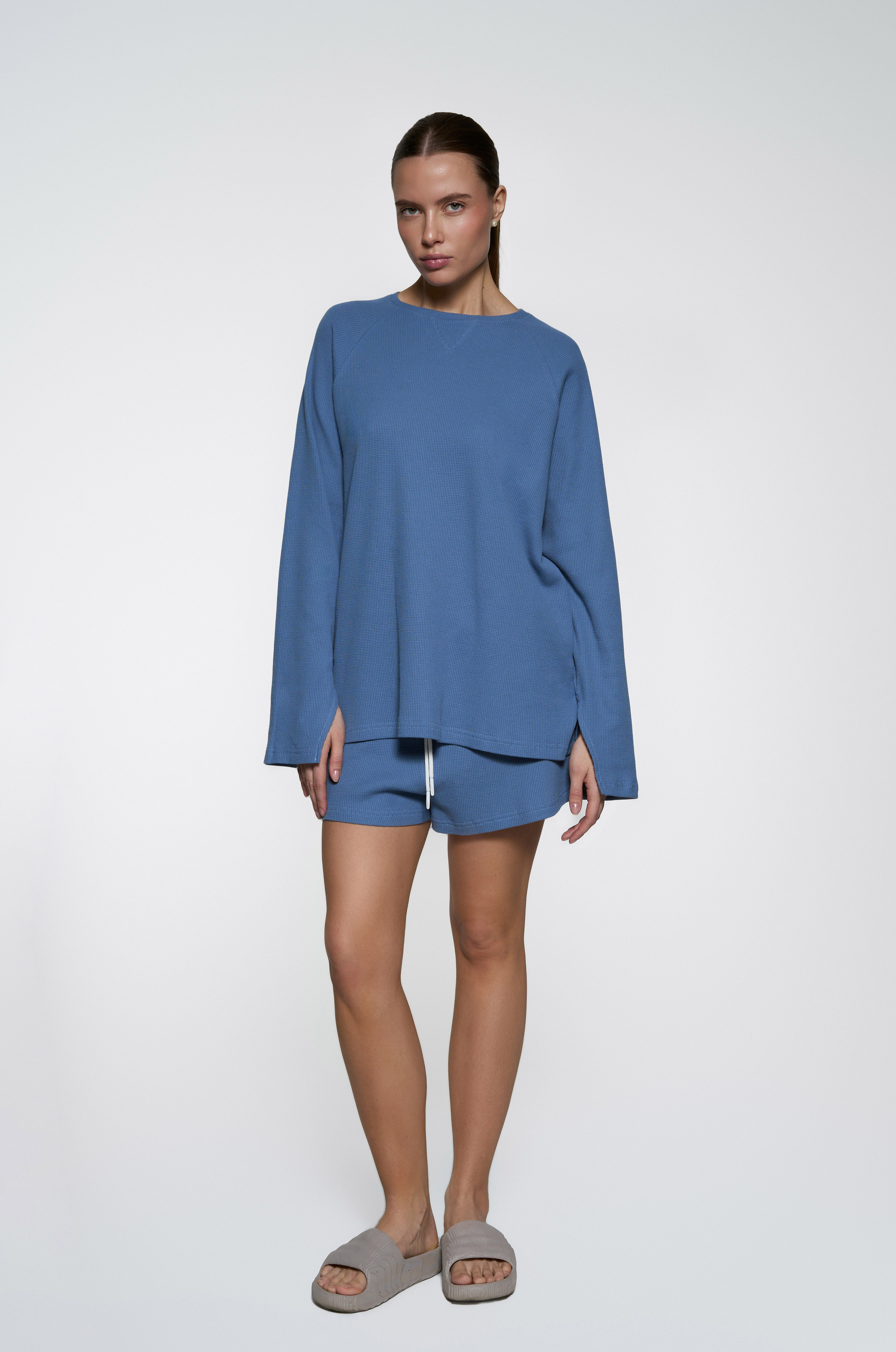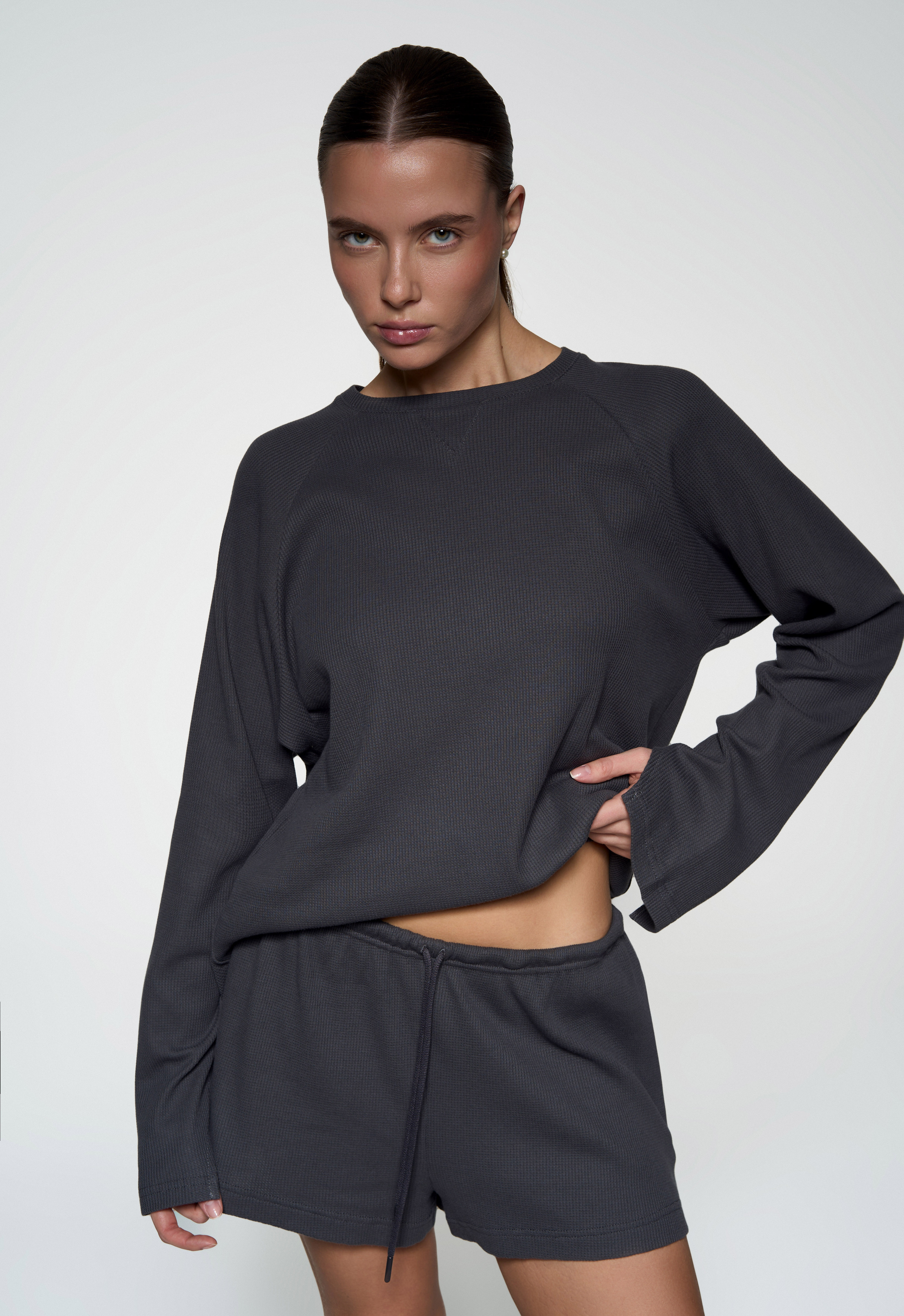 Базовый прямой лонгслив - Свободный крой - Треугольный разрез на рукавах - Мягкая вафельная ткань средней плотности.