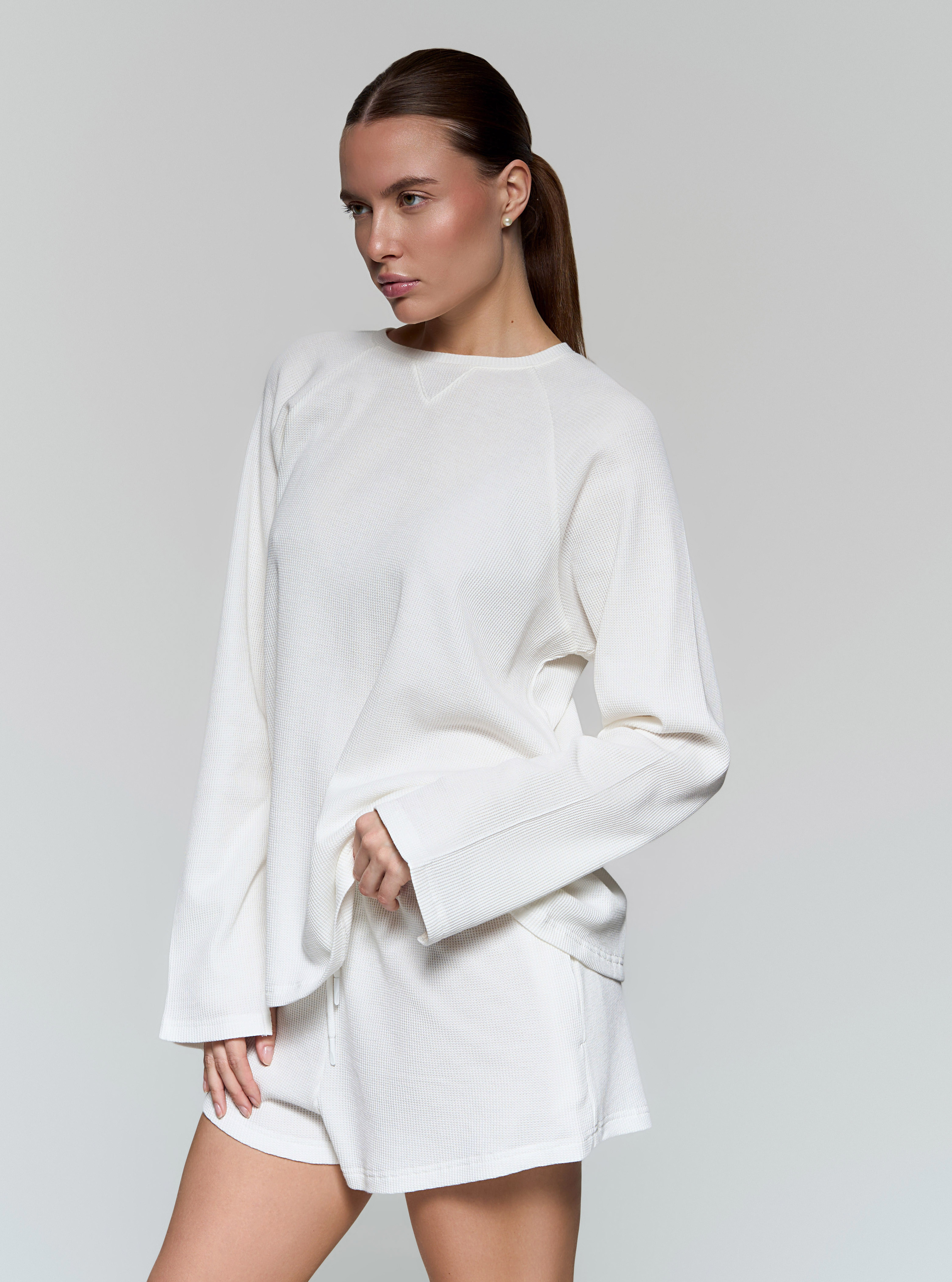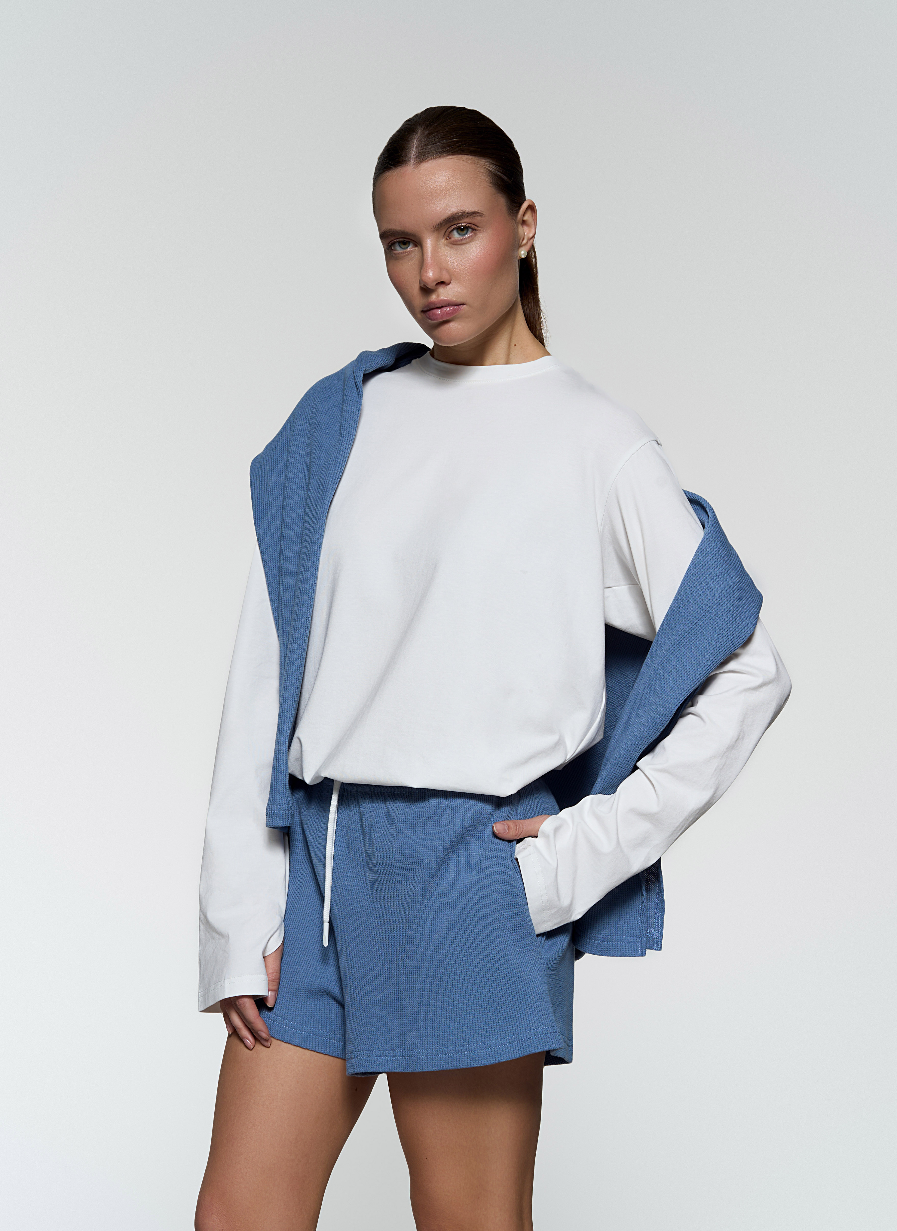 Шорты свободного силуэта -Мягкая вафельная ткань средней плотности. - Карманы в боковых швах - Пояс на резинке и шнурке