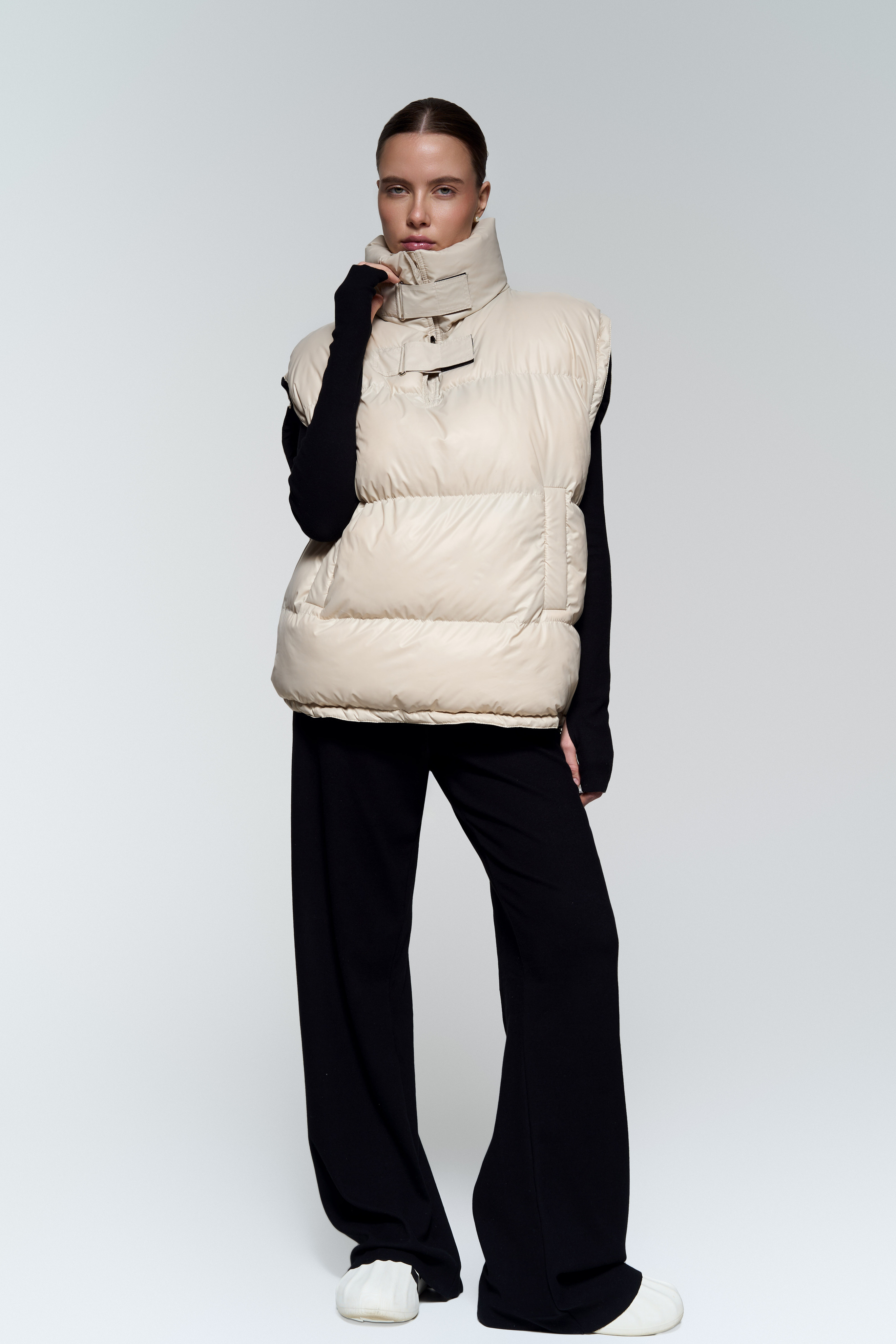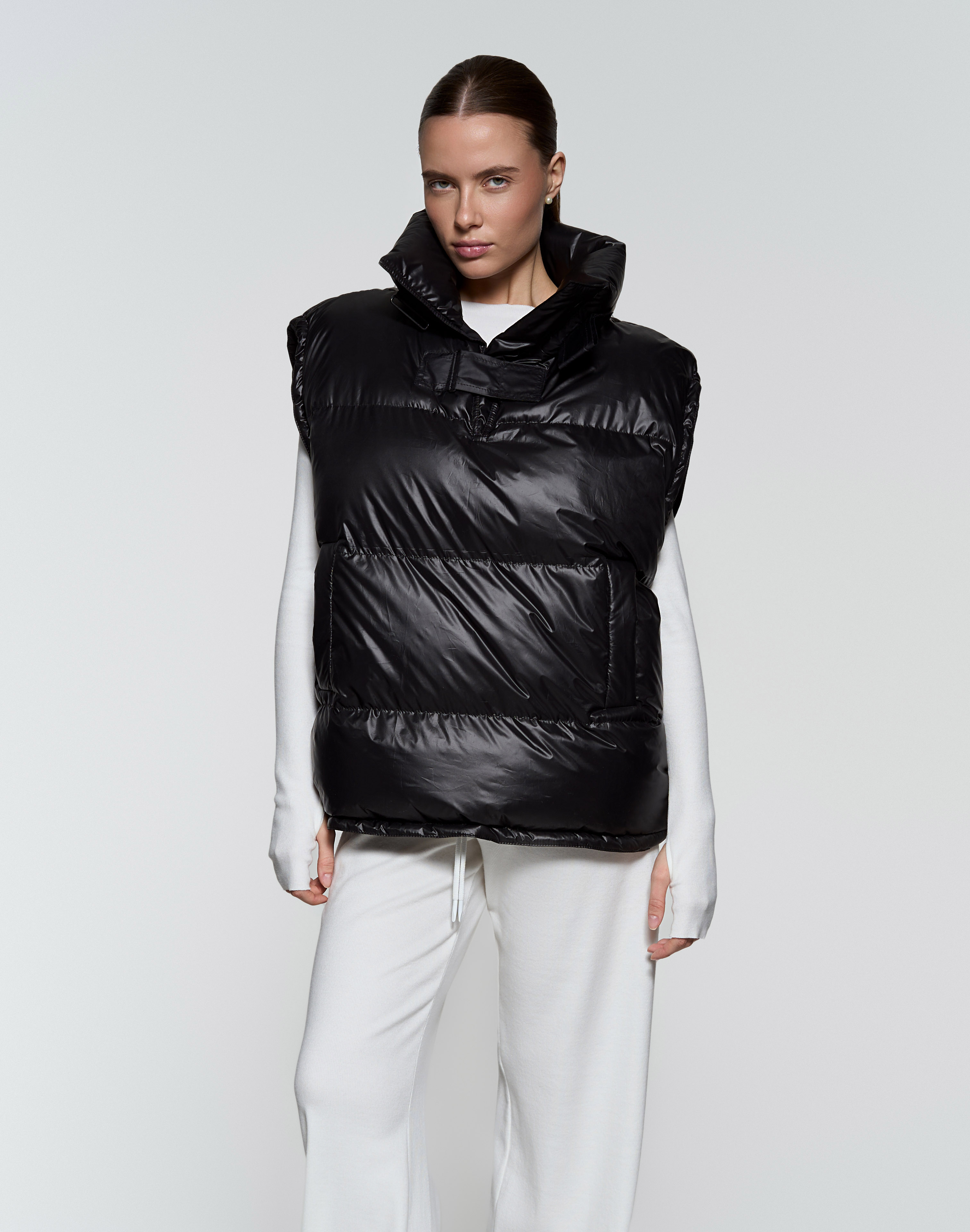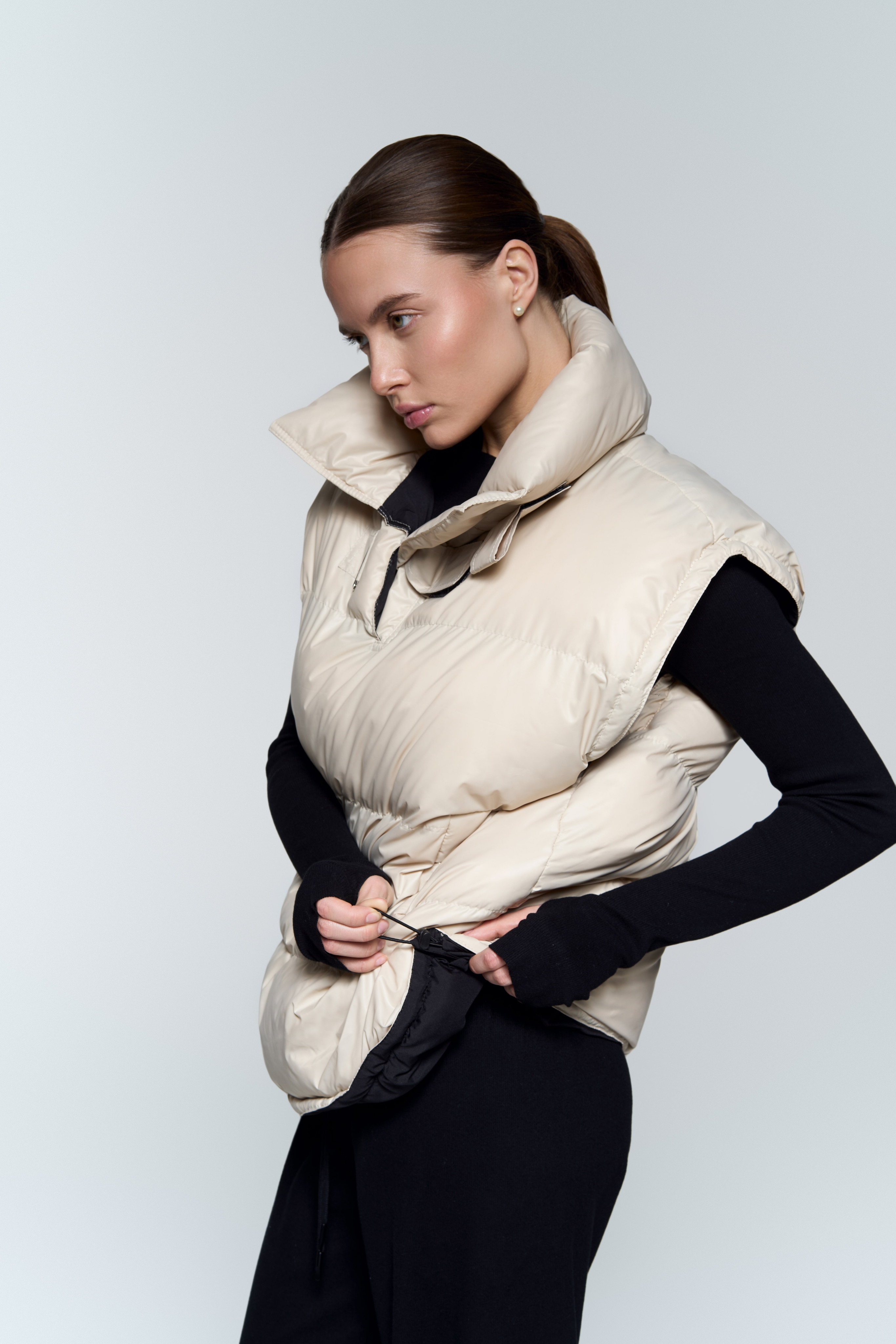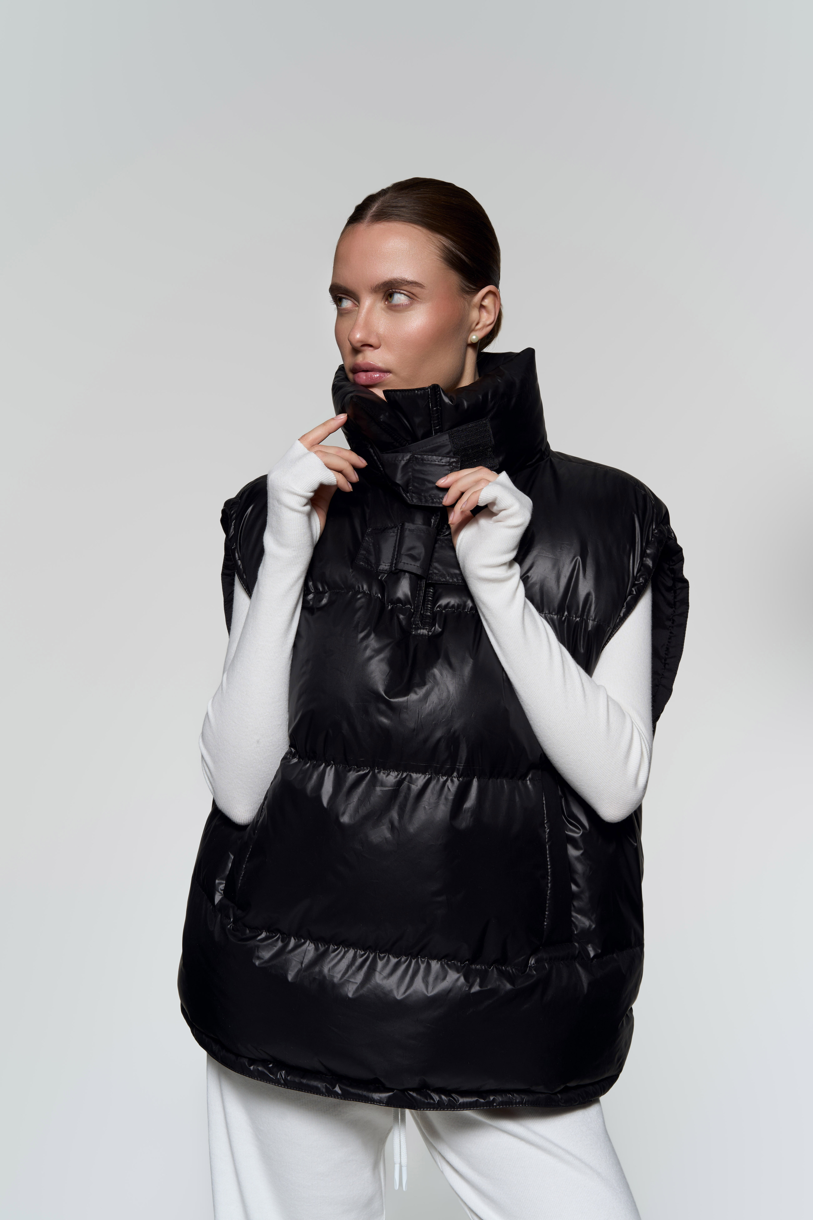 Жилет-анорак - Непромокаемая плащевка с мягким подкладом из вискозы - Наполнитель: лебяжий пух (гипоаллергенный) - Рукава и низ регулируются зажимами - Воротник с двумя застежками на липучках