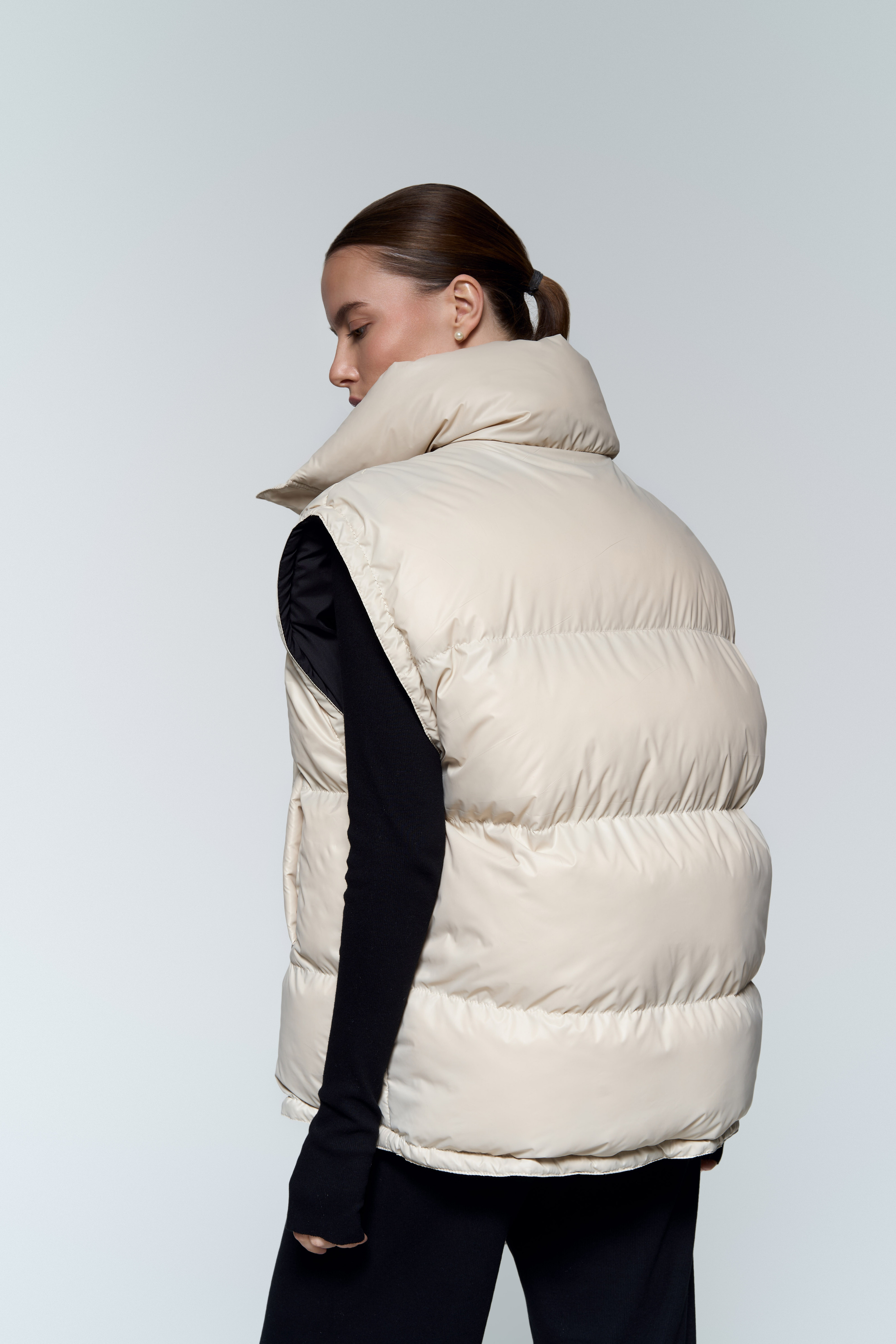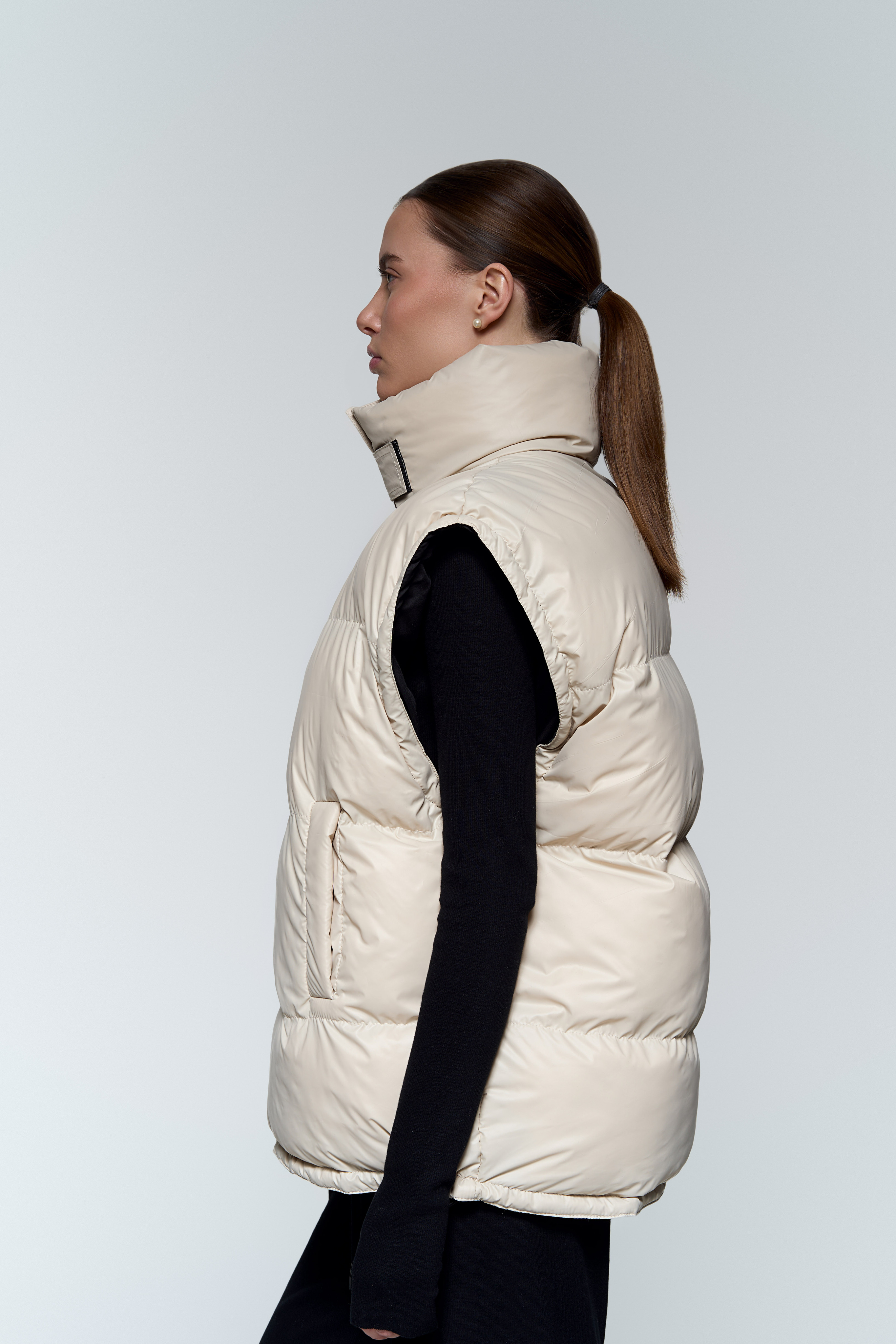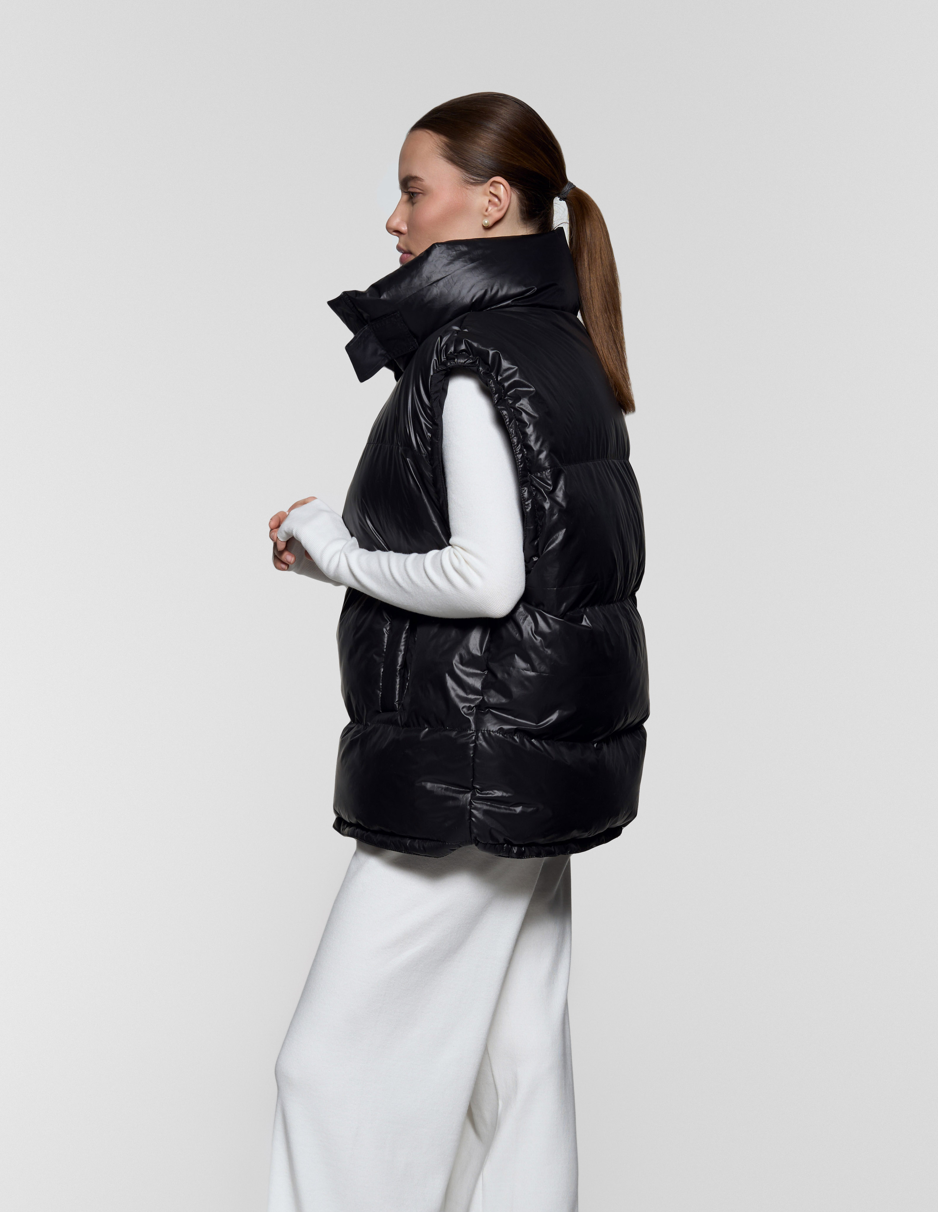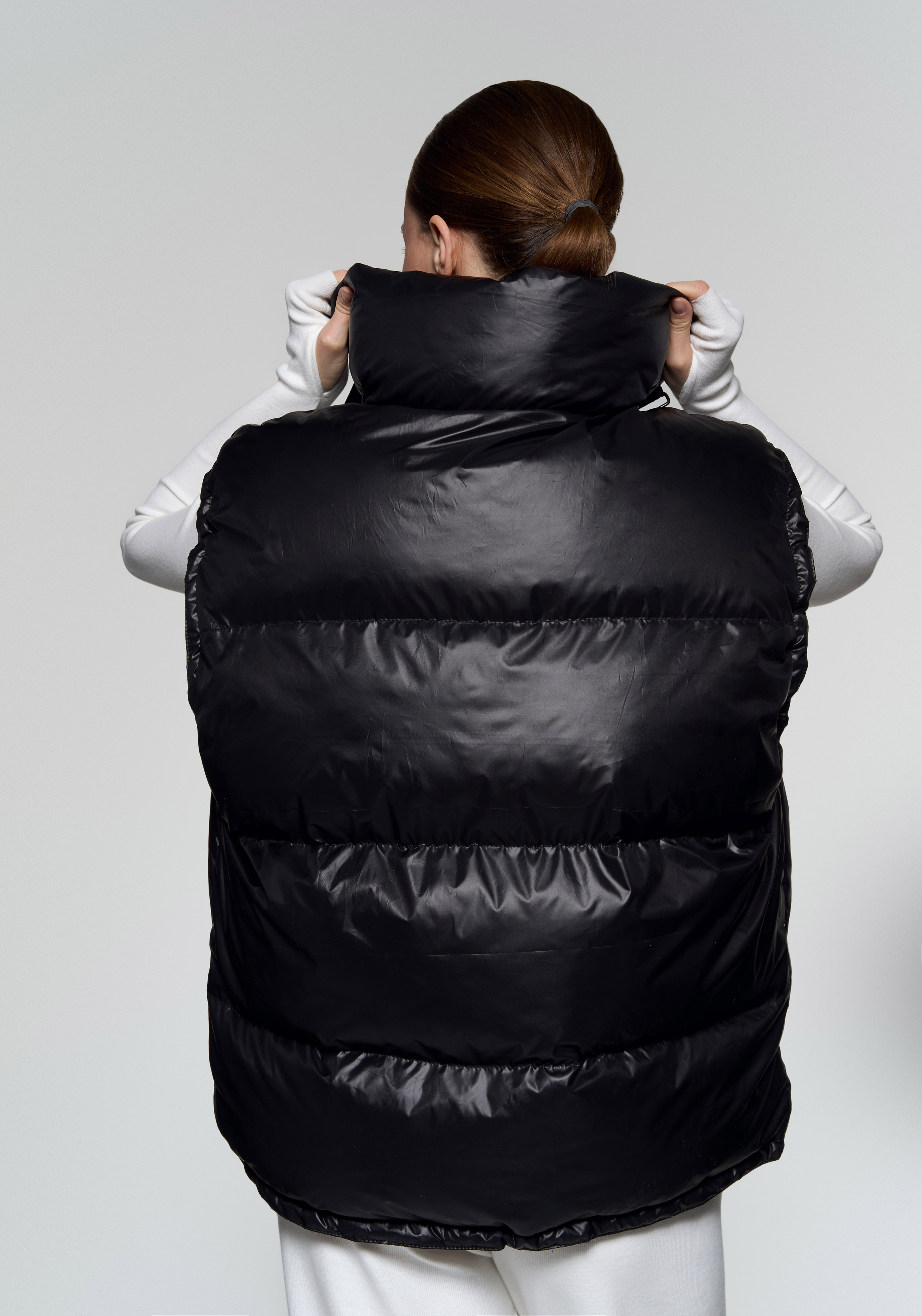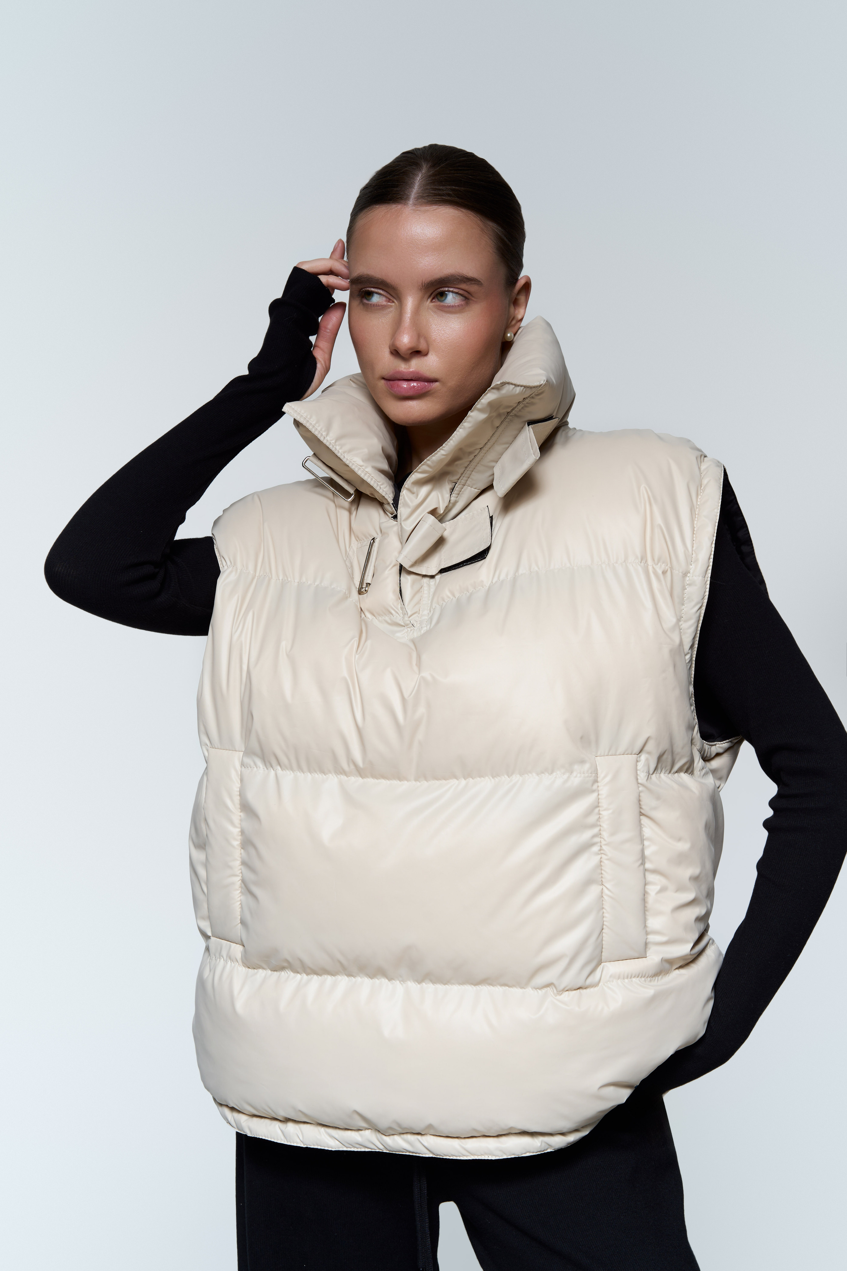Жилет-анорак - Непромокаемая плащевка с мягким подкладом из вискозы - Наполнитель: лебяжий пух (гипоаллергенный) - Рукава и низ регулируются зажимами - Воротник с двумя застежками на липучках